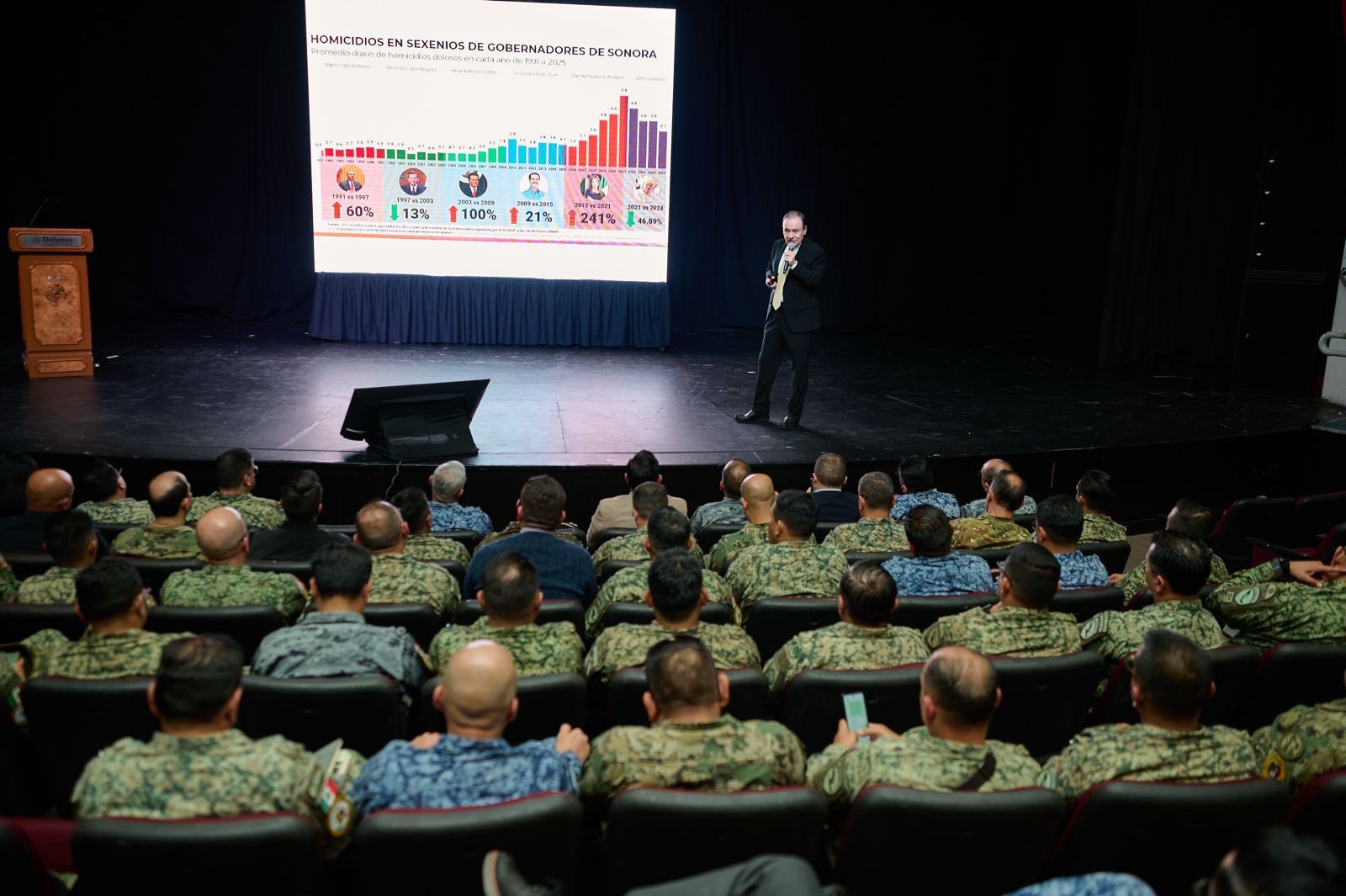 Ante una audiencia especializada en planeación estratégica y seguridad nacional, el jefe del Ejecutivo estatal destacó que los resultados del Plan Sonora ya son tangibles y de alto impacto, como la inversión de 16 mil millones de dólares en la planta de licuefacción de gas natural en Puerto Libertad, que genera empleo para más de 30 mil personas, así como la construcción del parque fotovoltaico más grande de Latinoamérica en Puerto Peñasco, con una inversión de mil 600 millones de dólares.